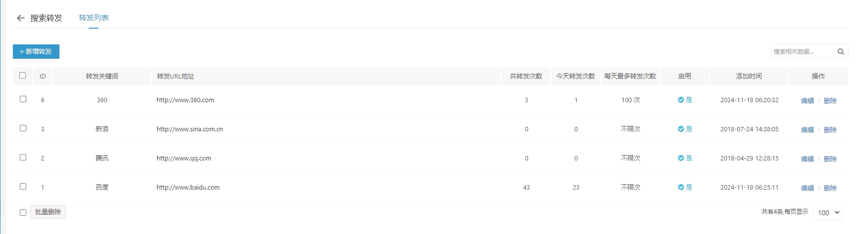 后台设置好关键词后,前端用户搜索对应的关键词将自动跳转到对应的转发URL地址!安装后添加即可,如果需要停用,可以禁止启用关键词,也可以禁用插件!